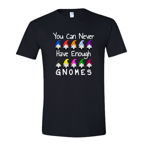 You Can Never Have Enough Gnomes t-shirt featuring Gnugget the Gnome and friends!