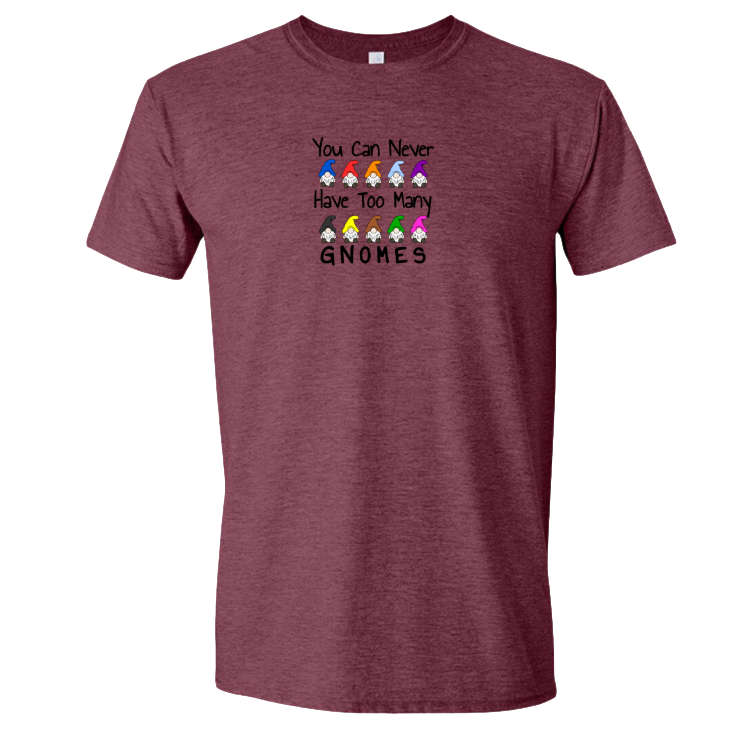 You Can Never Have Too Many Gnomes t-shirt featuring Gnugget the Gnome and friends.